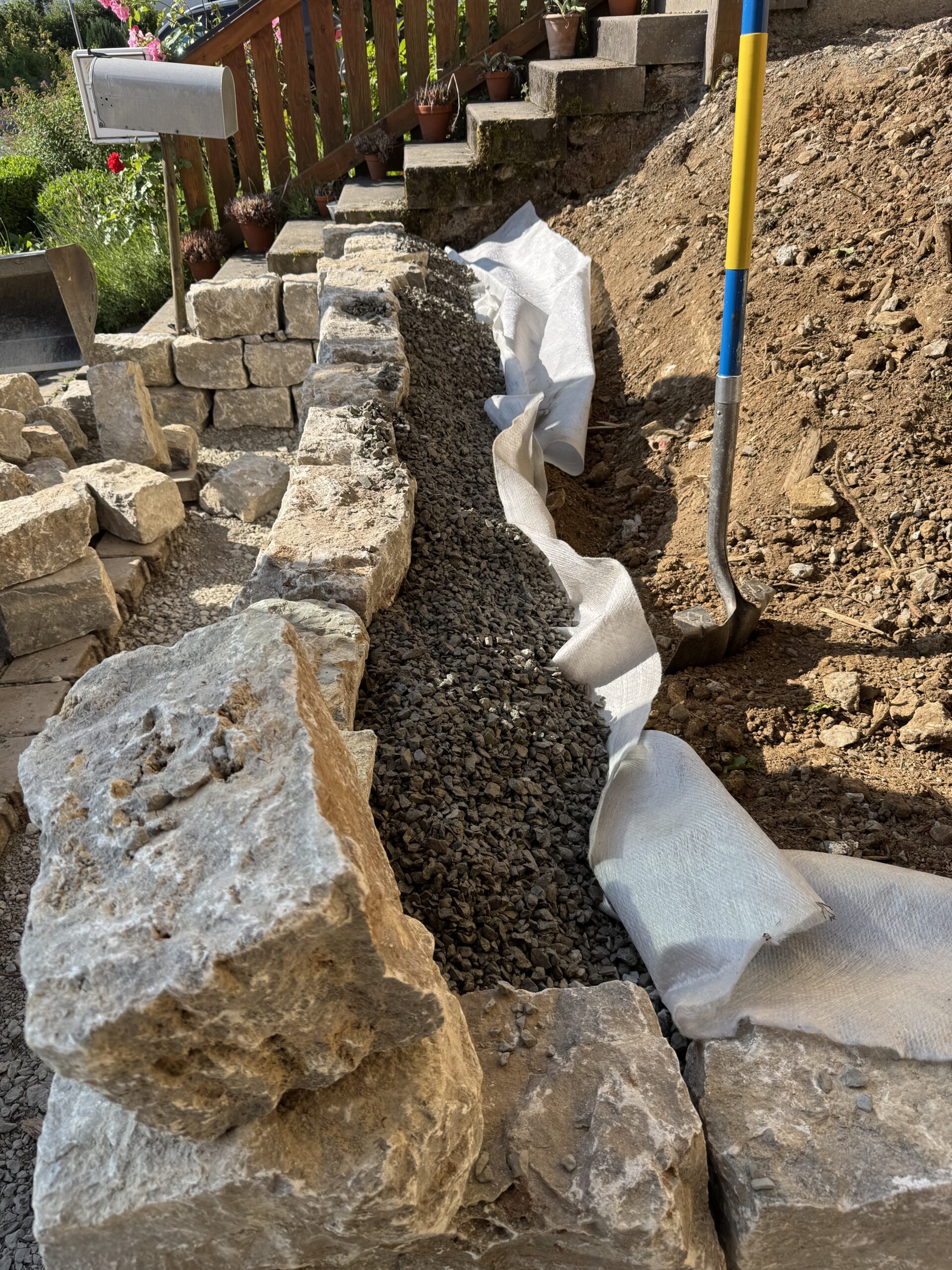 Zur dauerhaften Entlastung der Mauer wurde eine Drainageschicht eingebaut. Die Hinterfüllung mit geeignetem Material sorgt dafür, dass sich kein Wasserdruck aufbauen kann. Zusätzlich wurde eine Schutzbahn zur Gebäudeseite integriert.