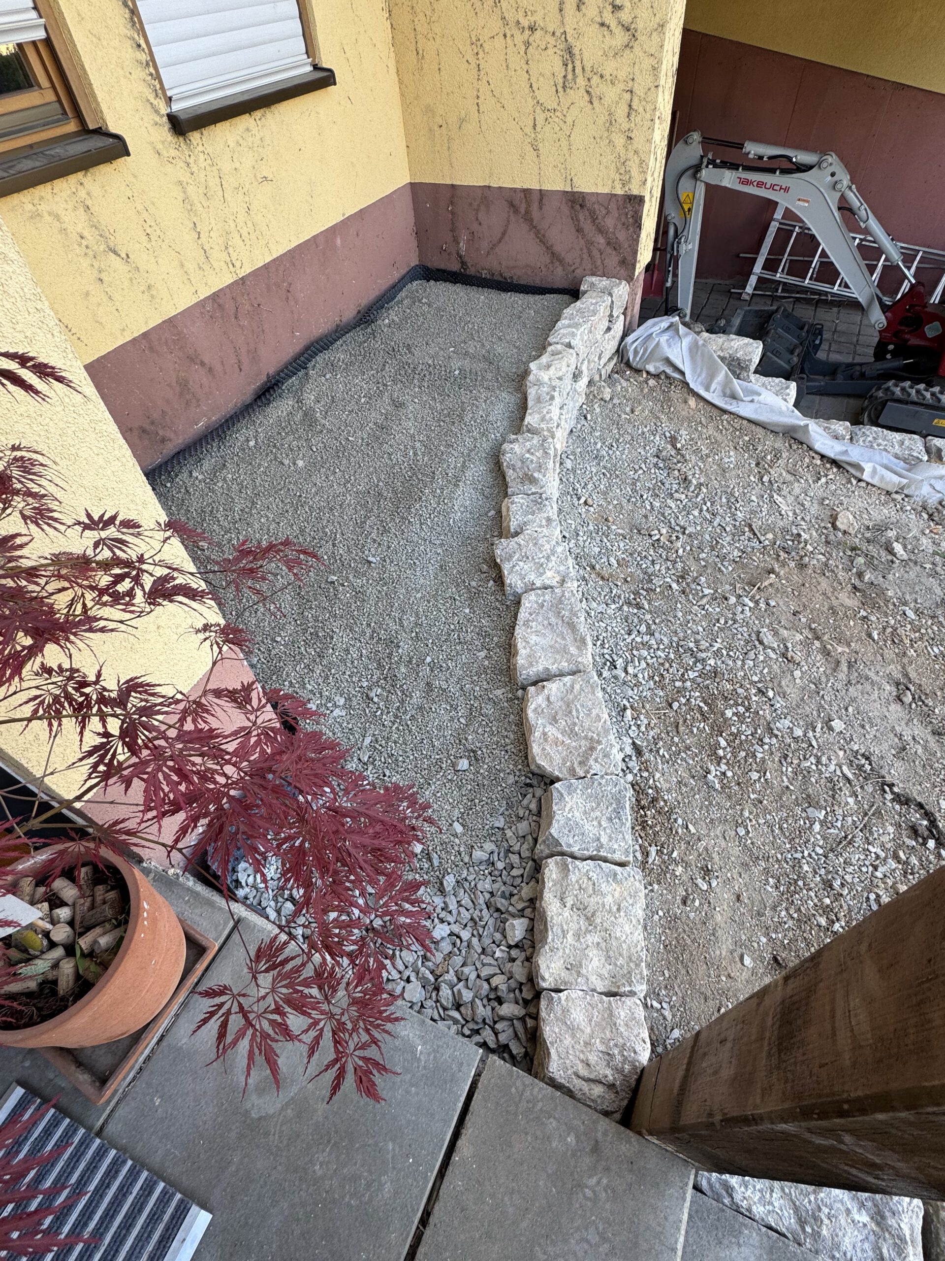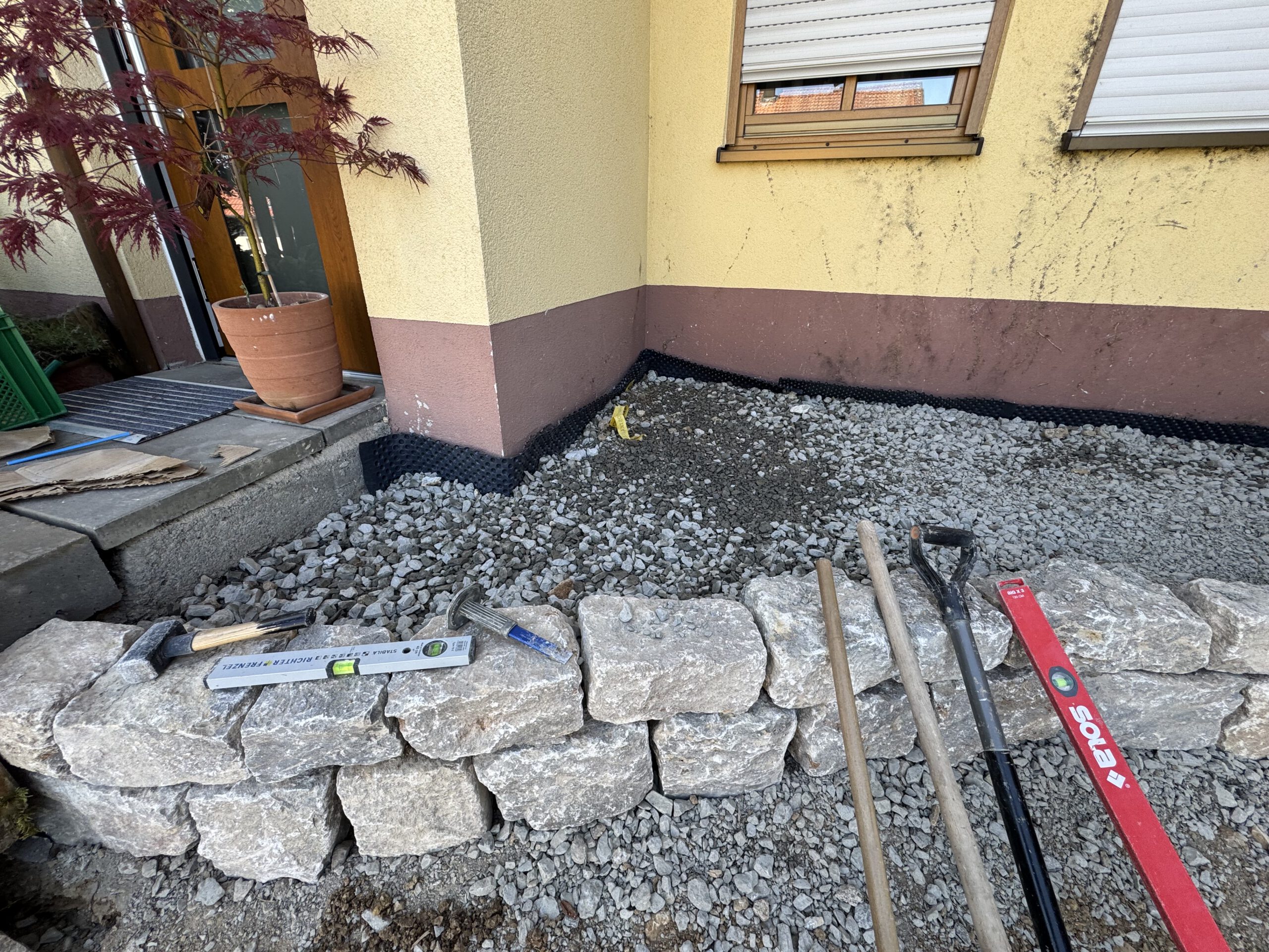 Eine frostsichere Schottertragschicht wurde eingebracht, nivelliert und mehrfach verdichtet. Diese sorgt für Stabilität und eine sichere Lastverteilung der Natursteinmauer.